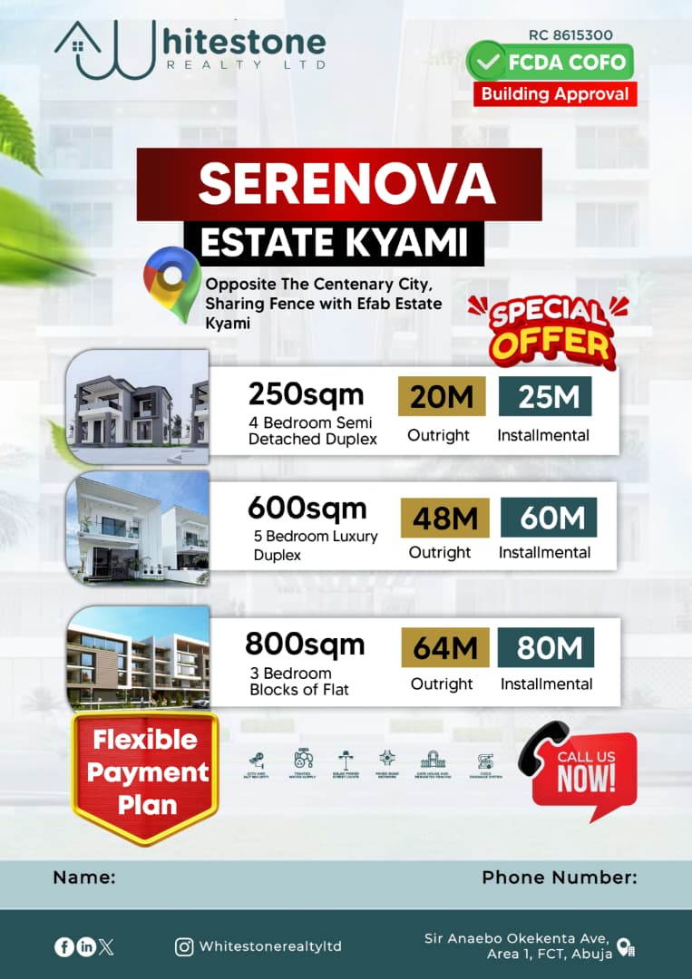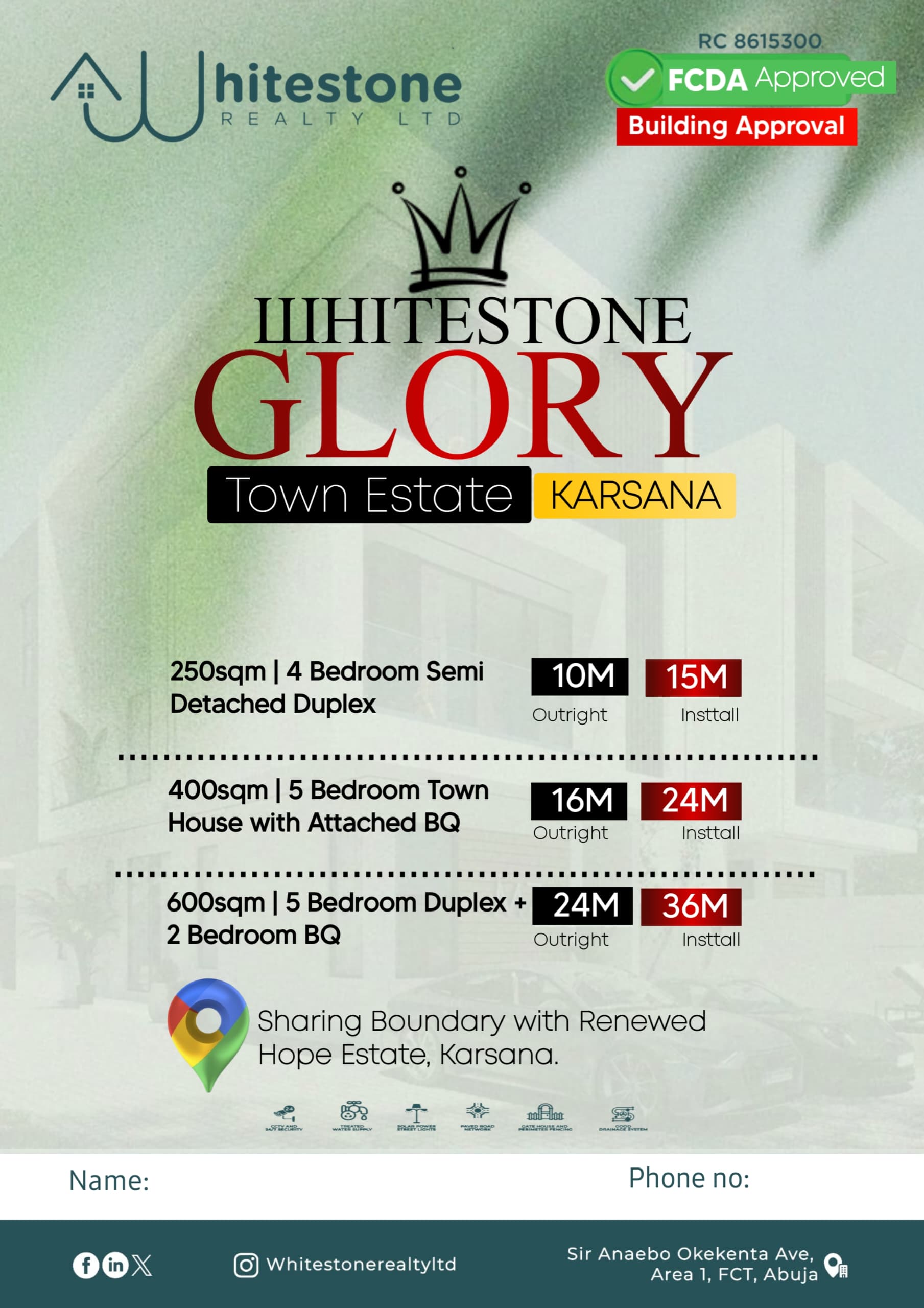 Discover exceptional modern living at Whitestone Glory Town Estate, a well-planned residential community located in the fast-growing district of Karsana, Abuja. Enjoy premium comfort, affordability,